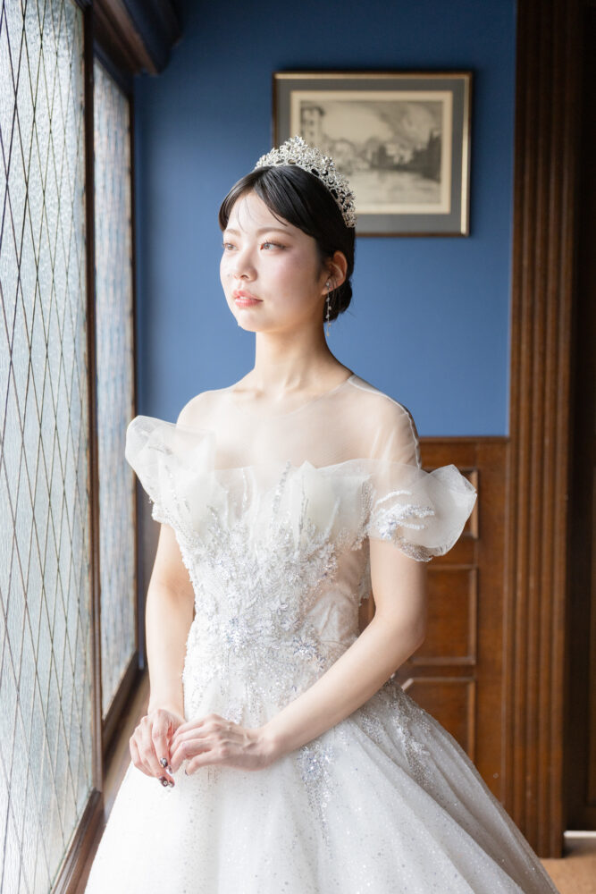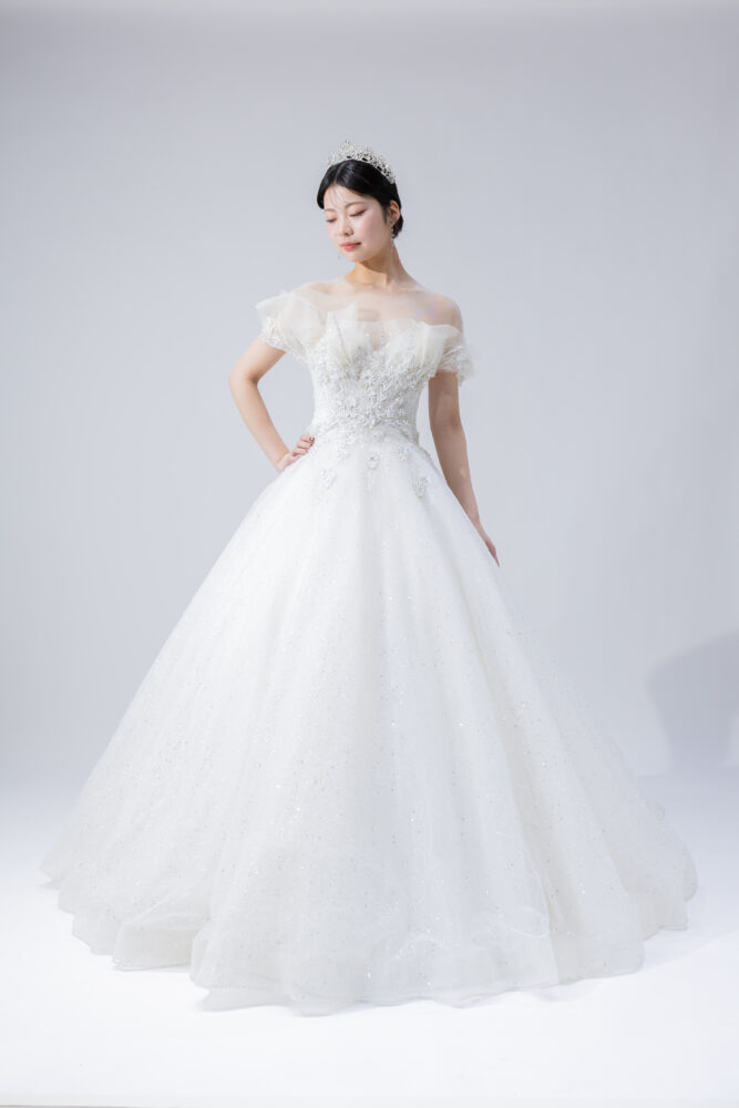 今回は、胸元に立体感のあるチュールを施したデザイン。そして、上半身を中心に、光るスローンが大振りから繊細なもまで、美しく散りばめられた一着。