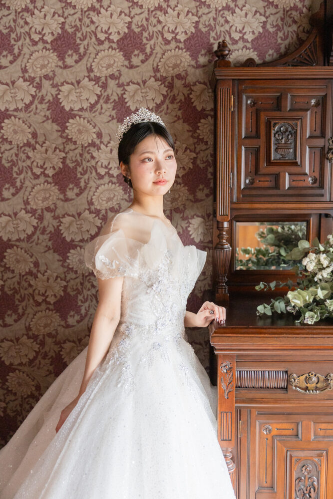 「IRES]の特徴でもある、女性らしさをテーマにしたドレスは、京都町家寫眞館のコンセプト「クラシックフォトウェディング」通り。