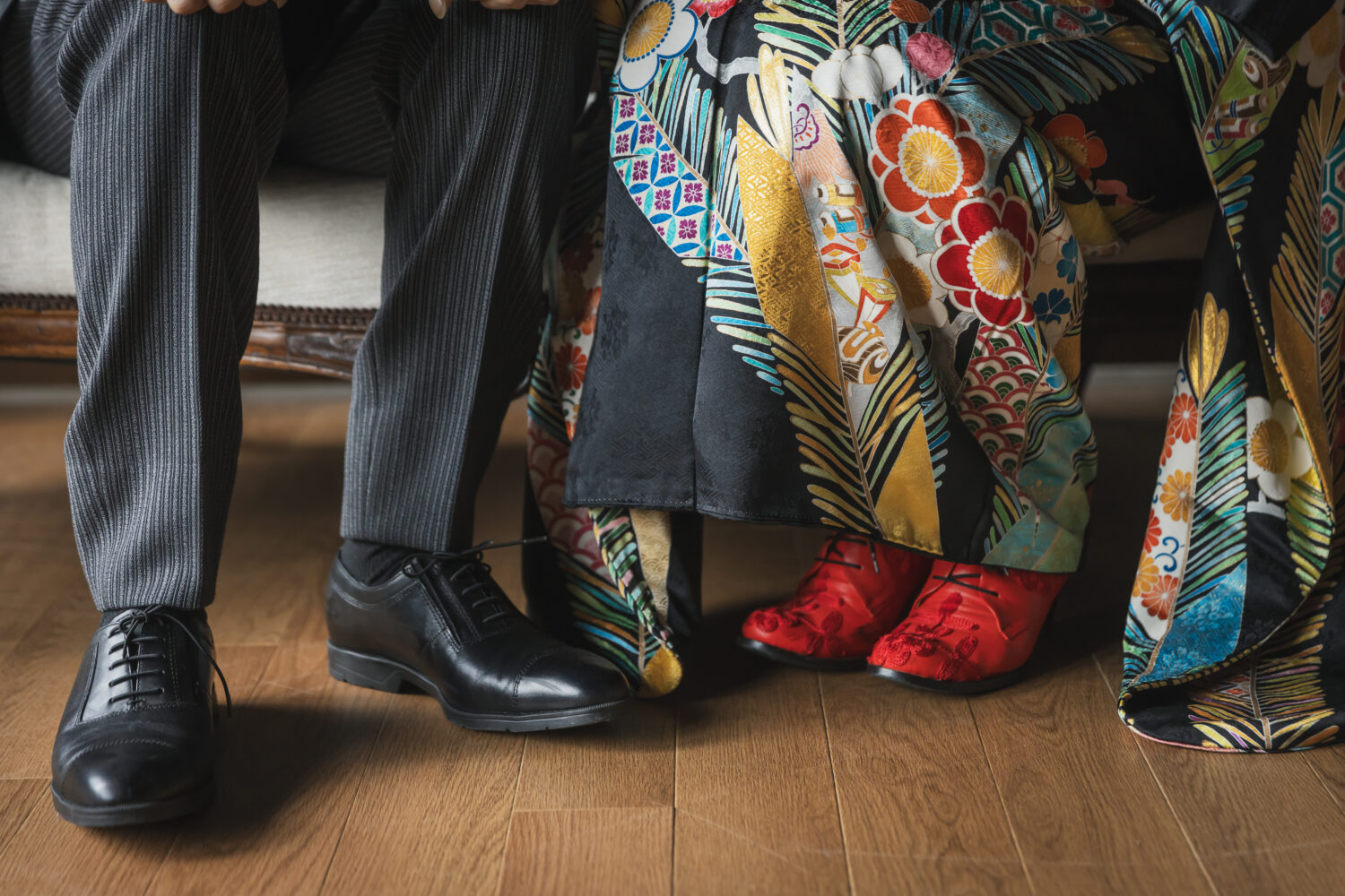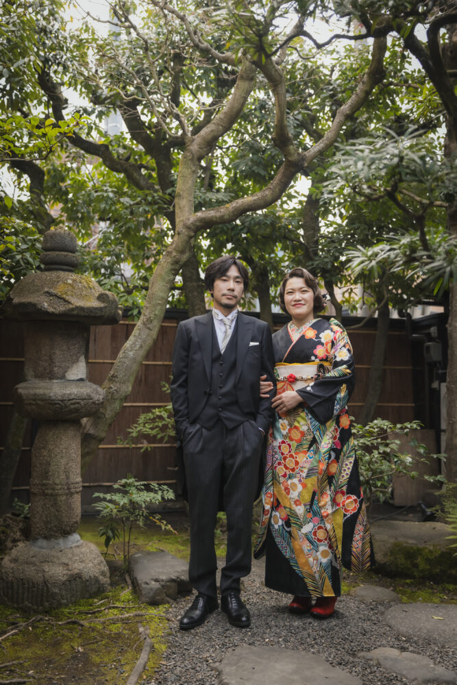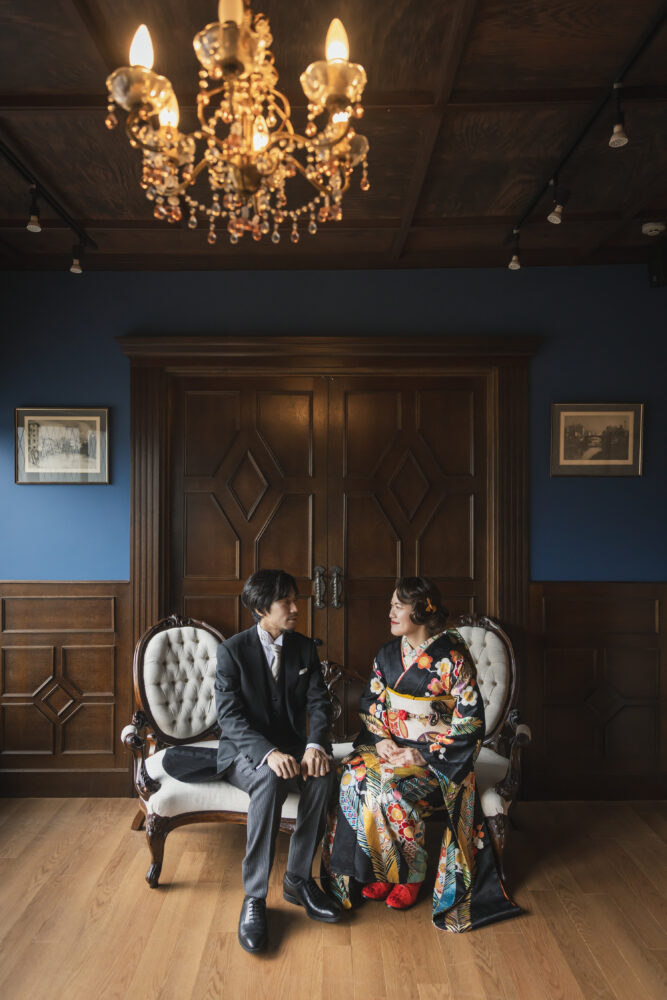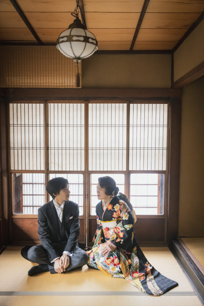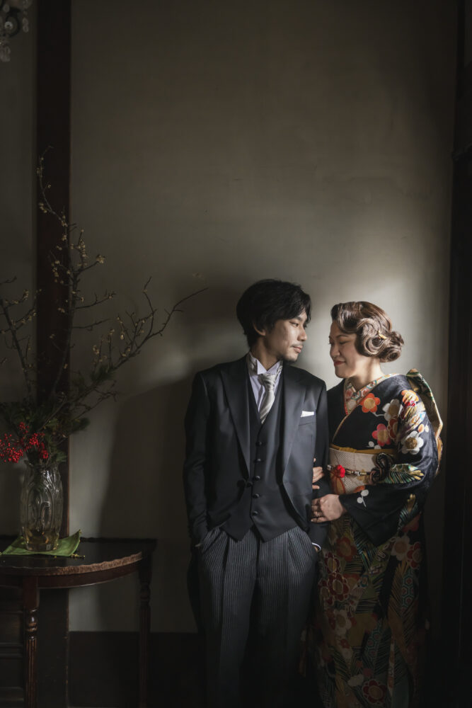 レトロなイメージの写真をご希望いただき、京町家のスタジオで振袖とモーニングのコーディネートで撮影をしていただきました。