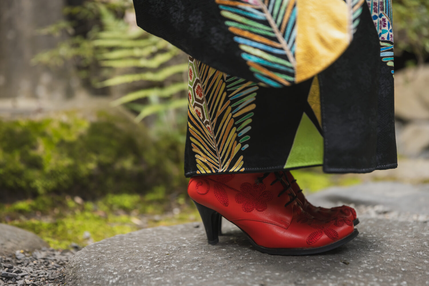 ブーツをいかすために振袖のたけも少し短めに。これは着付け師のこだわり。