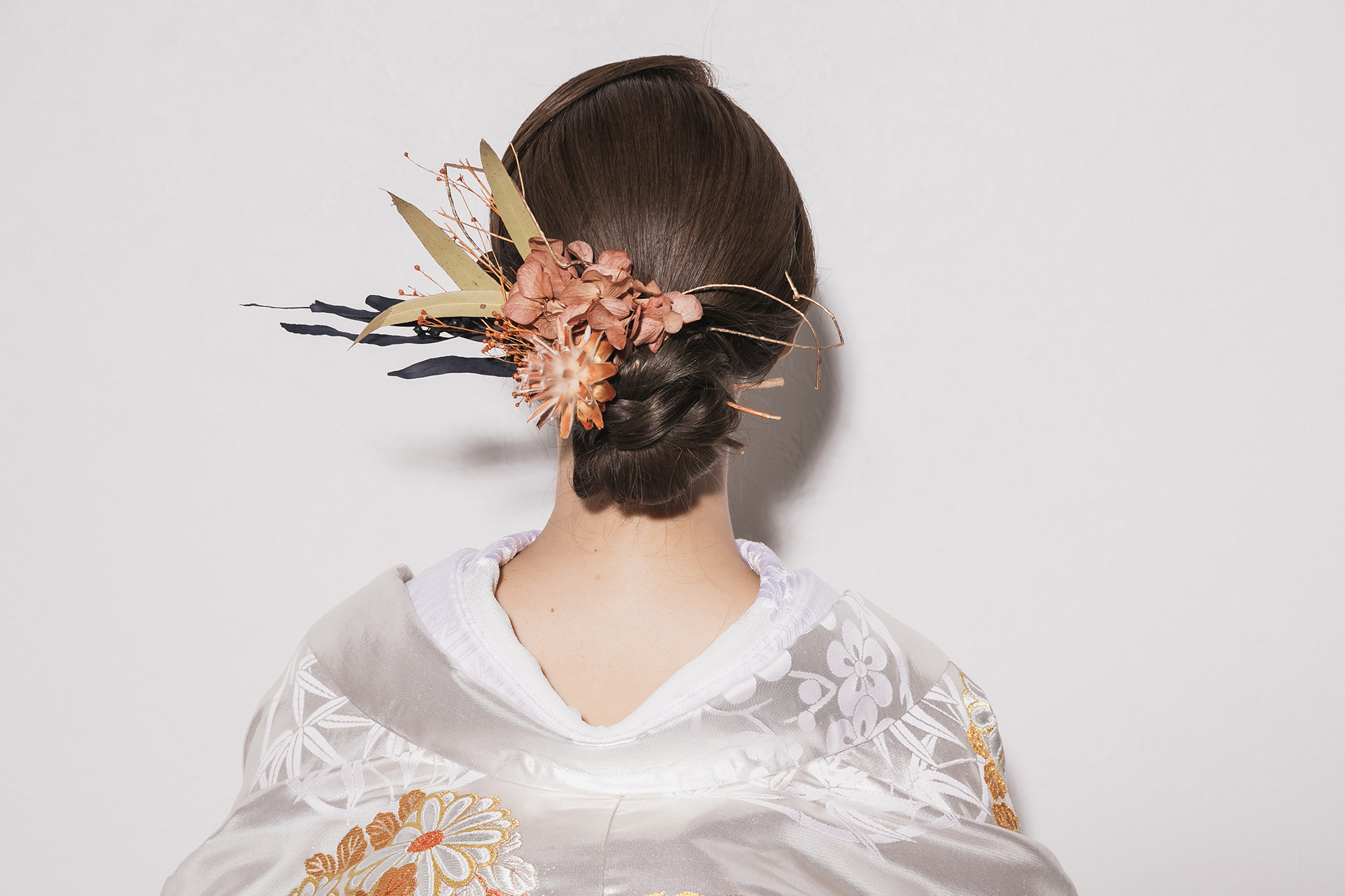 すっきりシンプルなシニヨンに印象的なヘッドパーツを合わせて☆ こちらのヘッドパーツは京都町家寫眞館でレンタルしております。 ※ドライフラワーや繊細な飾りは破損の為、ご用意が無い場合もあります。