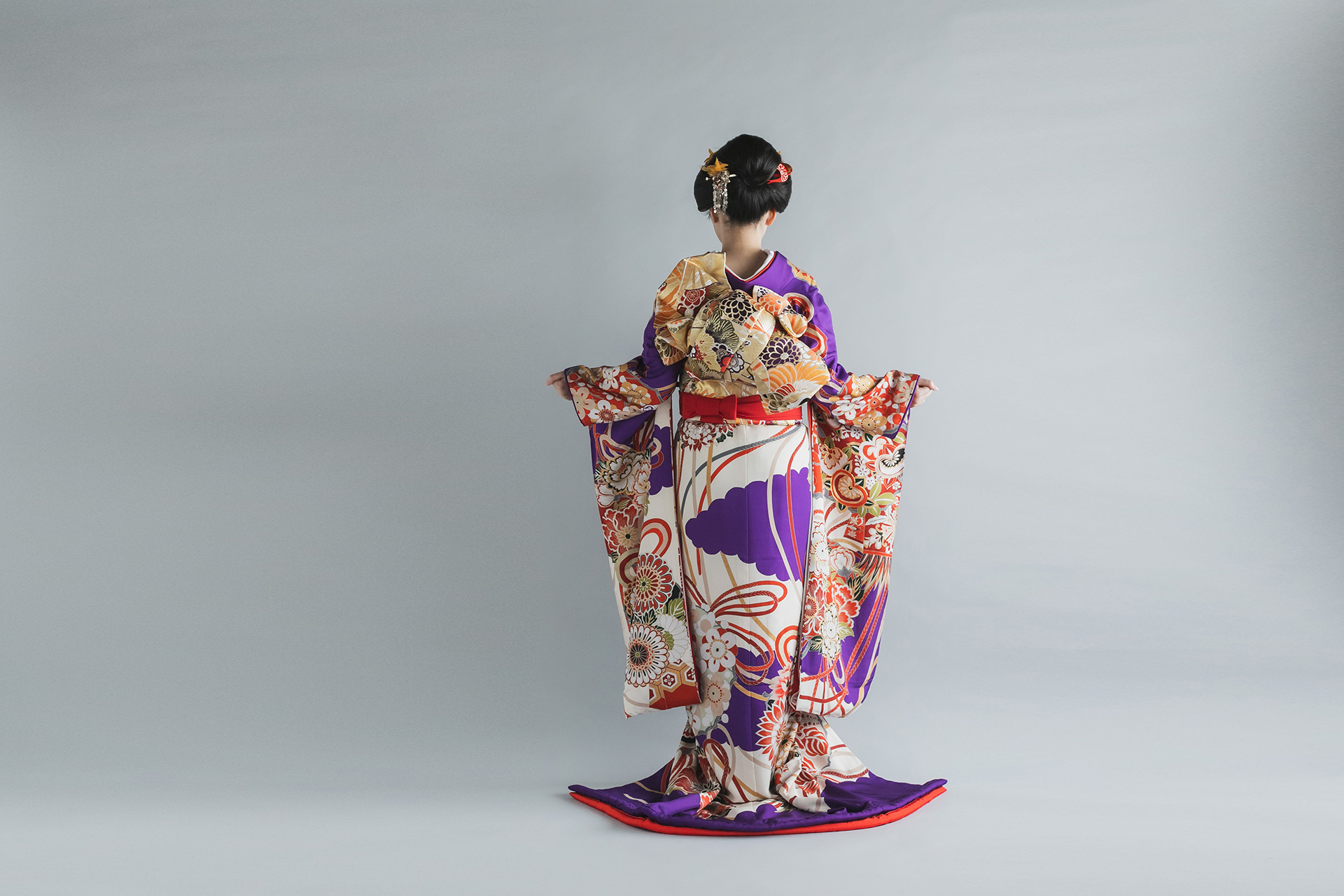 引き振袖は帯結びも華やかで後ろ姿がとてもステキです。 打掛も豪華ですが引き振袖で撮影はいかがでしょうか(^^♪ 是非、みなさまのお問い合わせお待ちしております!