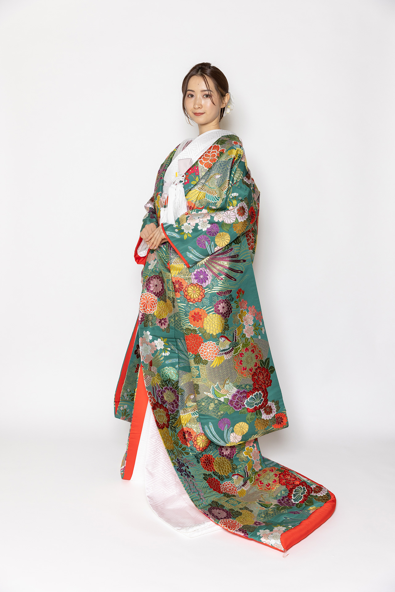 珍しい濃いエメラルドグリーンの色打掛です。