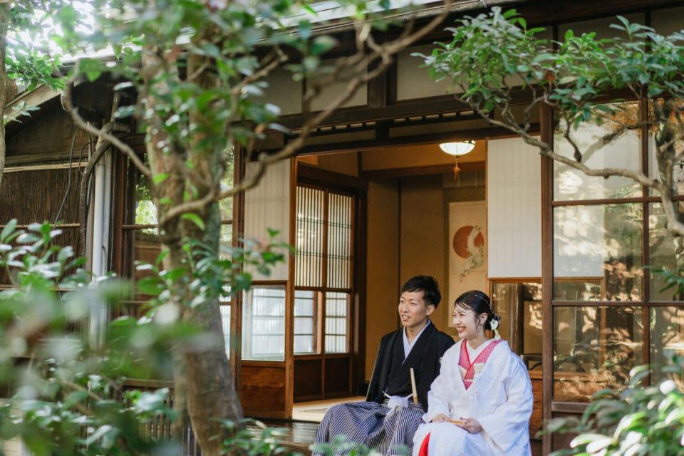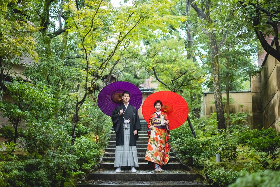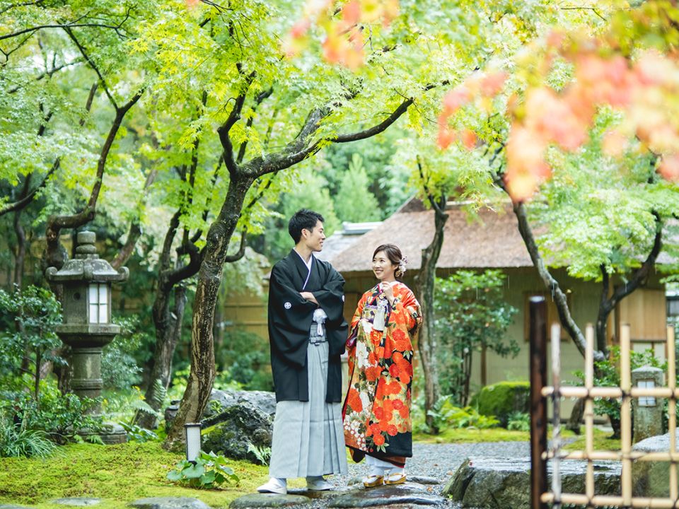 敷地内にある七代目小川治兵衛(植治)による美しい日本庭園での撮影が可能。この庭園は、四季折々の風情を感じられる特別なロケーションとして、多くのカップルに選ばれています。