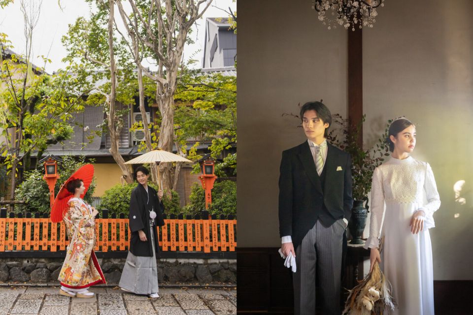 京の都巡りと京町家を楽しめる満喫プラン。和装と最高級ドレスの「Cannt Bella Dress」でワンランク上の撮影をお楽しみいただけます。和装で京の街を巡り、和の空間と英国アンティークスタジオでCannt Bellaのドレスでうっとりするような写真をお届けします。