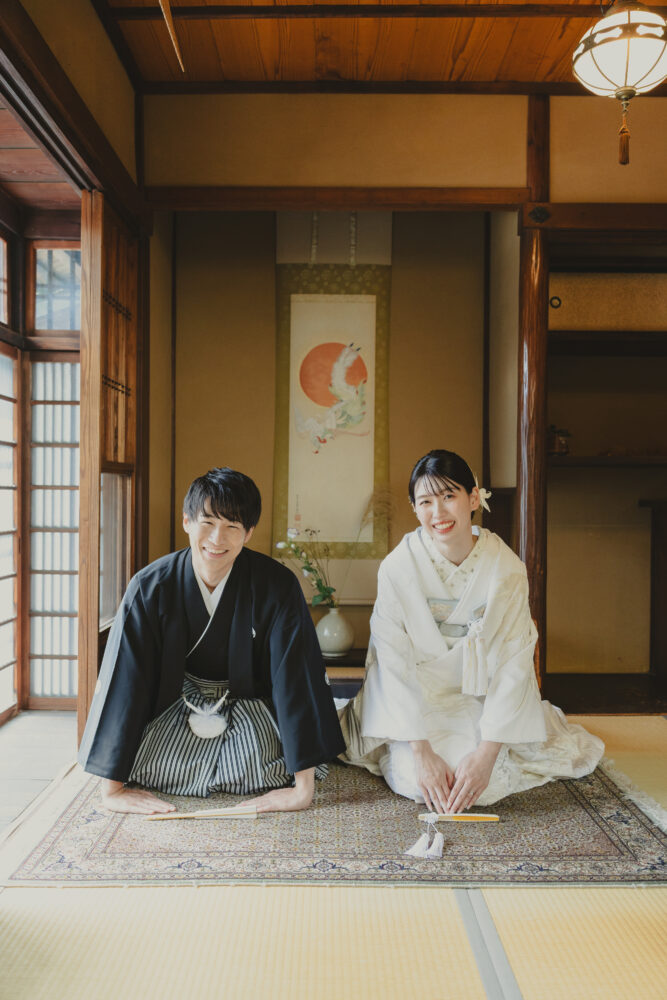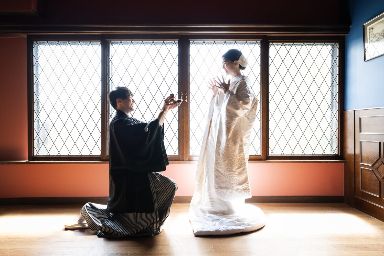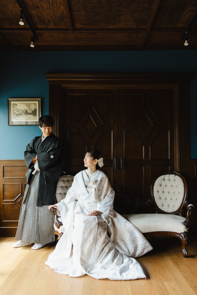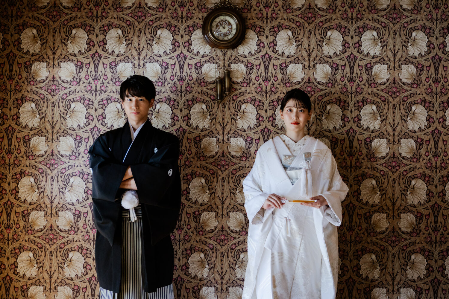 撮影は、伝統的な京町家とアンティーク調のスタジオの二つのスタジオで行われました。新郎様は黒紋付に縞模様の袴、新婦様は白無垢という、伝統的な和装姿がそれぞれの空間に美しく映えてくれました。