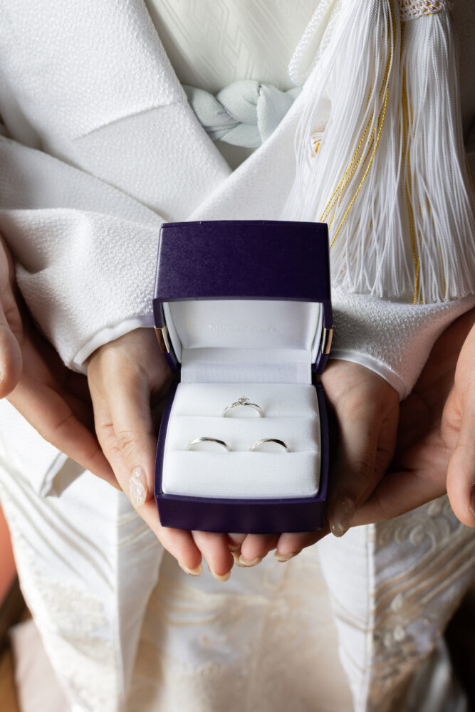 撮影のハイライトの一つは、お二人の結婚指輪と婚約指輪のショットです。和の美意識が息づく素敵なブランド「NIWAKA」の指輪は、お二人の門出の瞬間をさらに輝かせます。白無垢の袖口から見える新婦様の手元と、お二人の指輪が収められた上品な紫色のケースが、これからの人生を共にする誓いを象徴しているようです。
