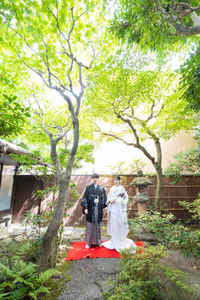 • 京町家:では、縁側から陽の光が差し込む広間で、お二人仲良く正座されるショットや、緑豊かな日本庭園での撮影は、和装の魅力を最大限に引き立てています。
