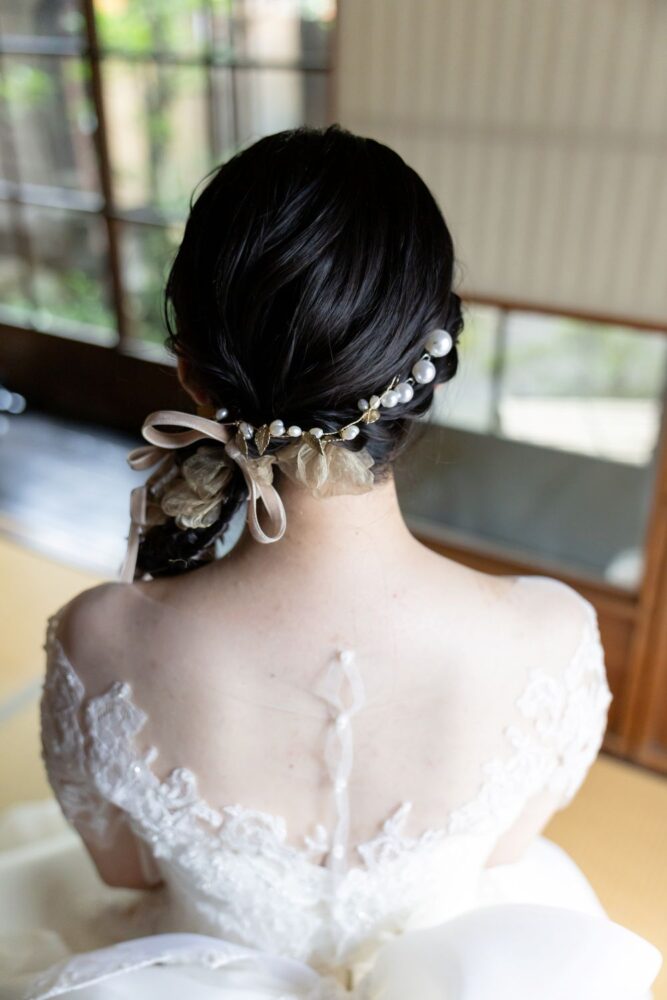 リボンをアレンジしパールをさりげなく散りばめたヘアアクセサリー。