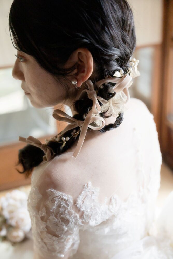ドレススタイルに合わせたヘアは、クラシカルな雰囲気が漂う 編みおろしアレンジ。