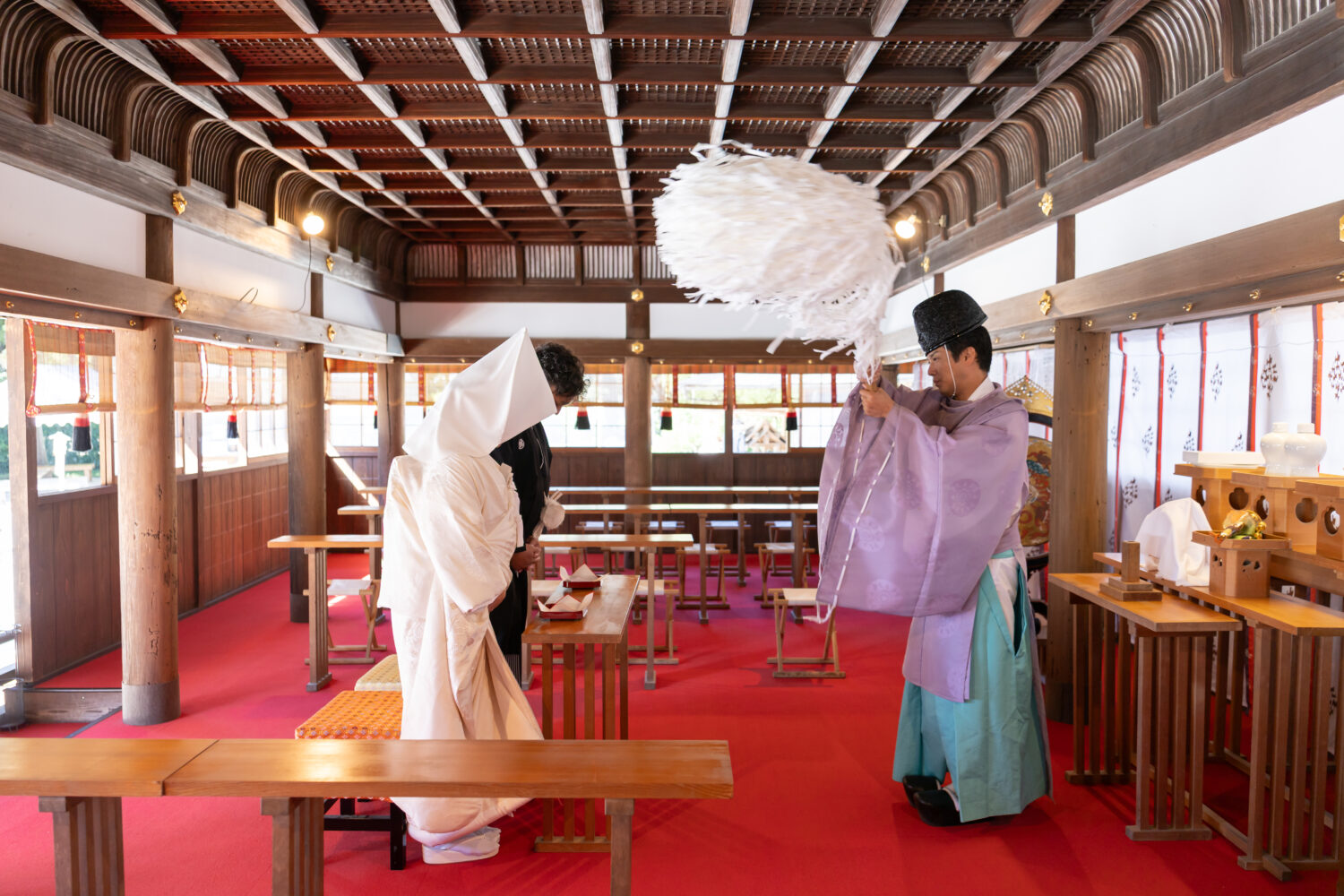 新しい門出を迎えられるおふたりの姿に、拝殿の奥に差し込む光がすっと伸びて、凛とした空気が漂います。