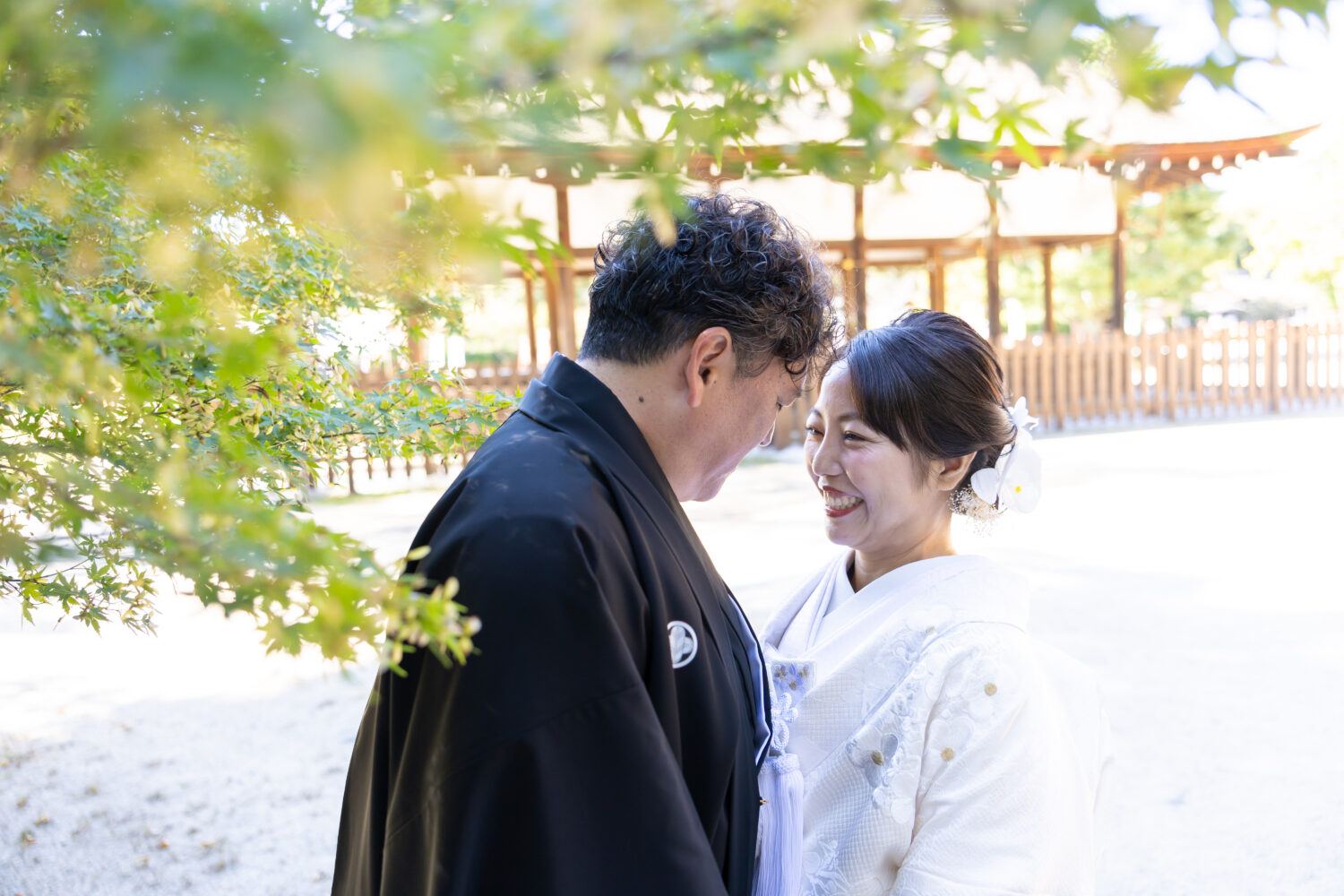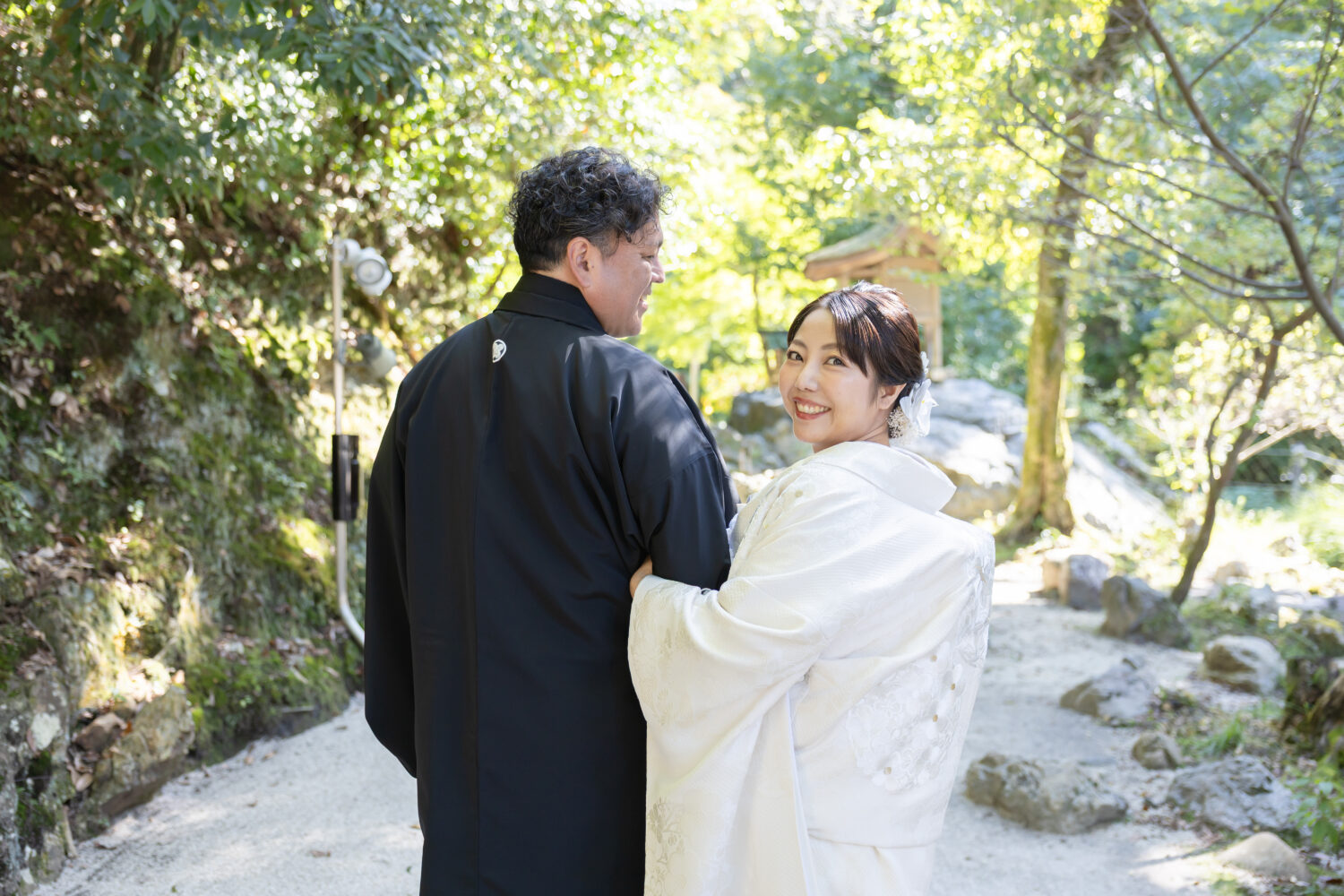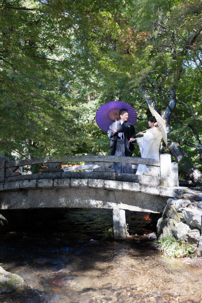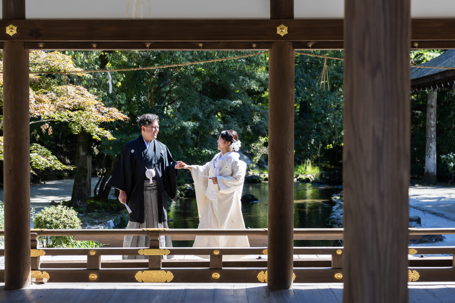 境内へ一歩足を踏み入れると、豊かな緑と澄んだ空気、おふたりが歩かれる度に袖が柔らかく風に揺れ、光が欄干に反射して表情をやさしく照らしてくれました。