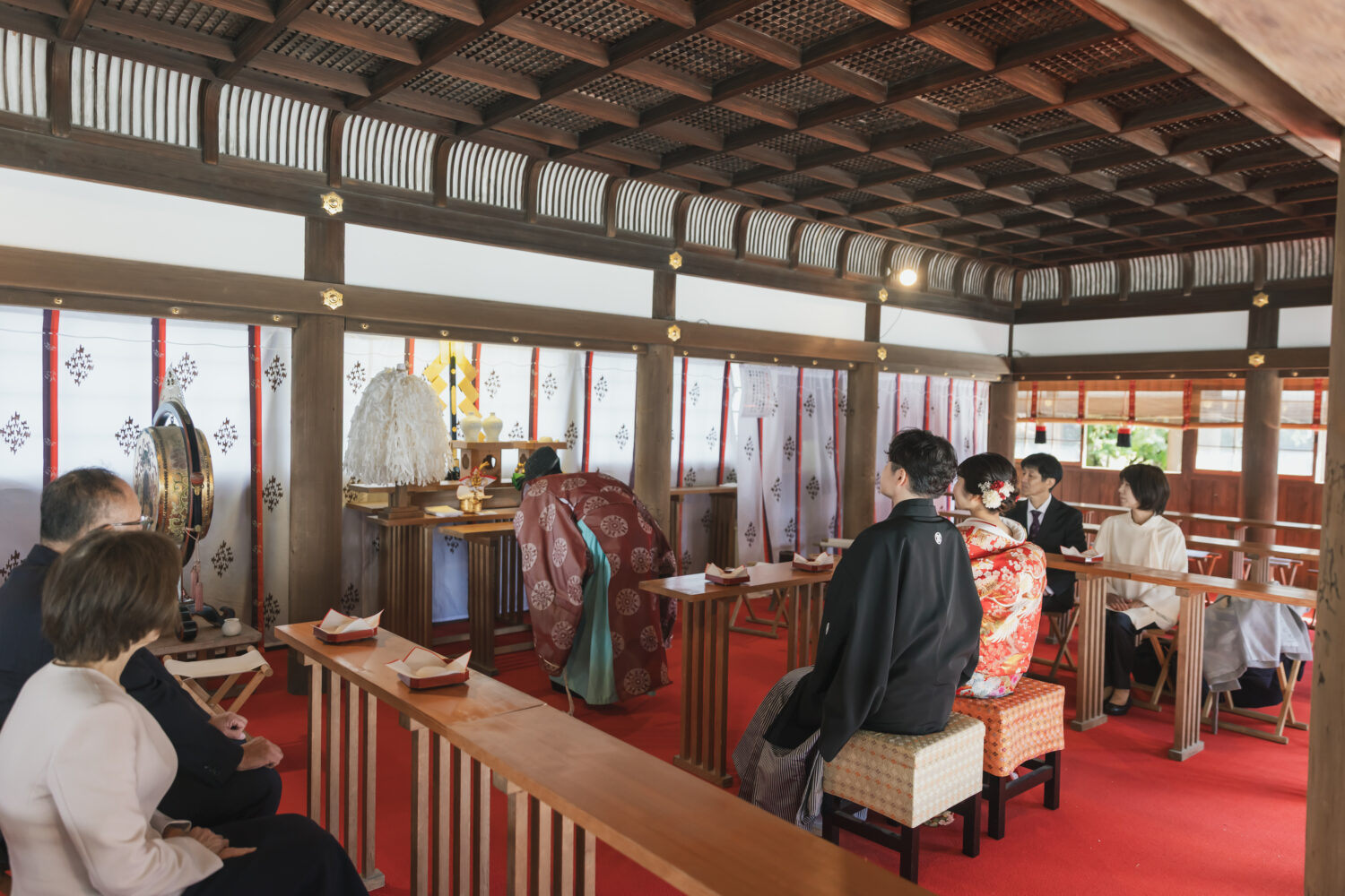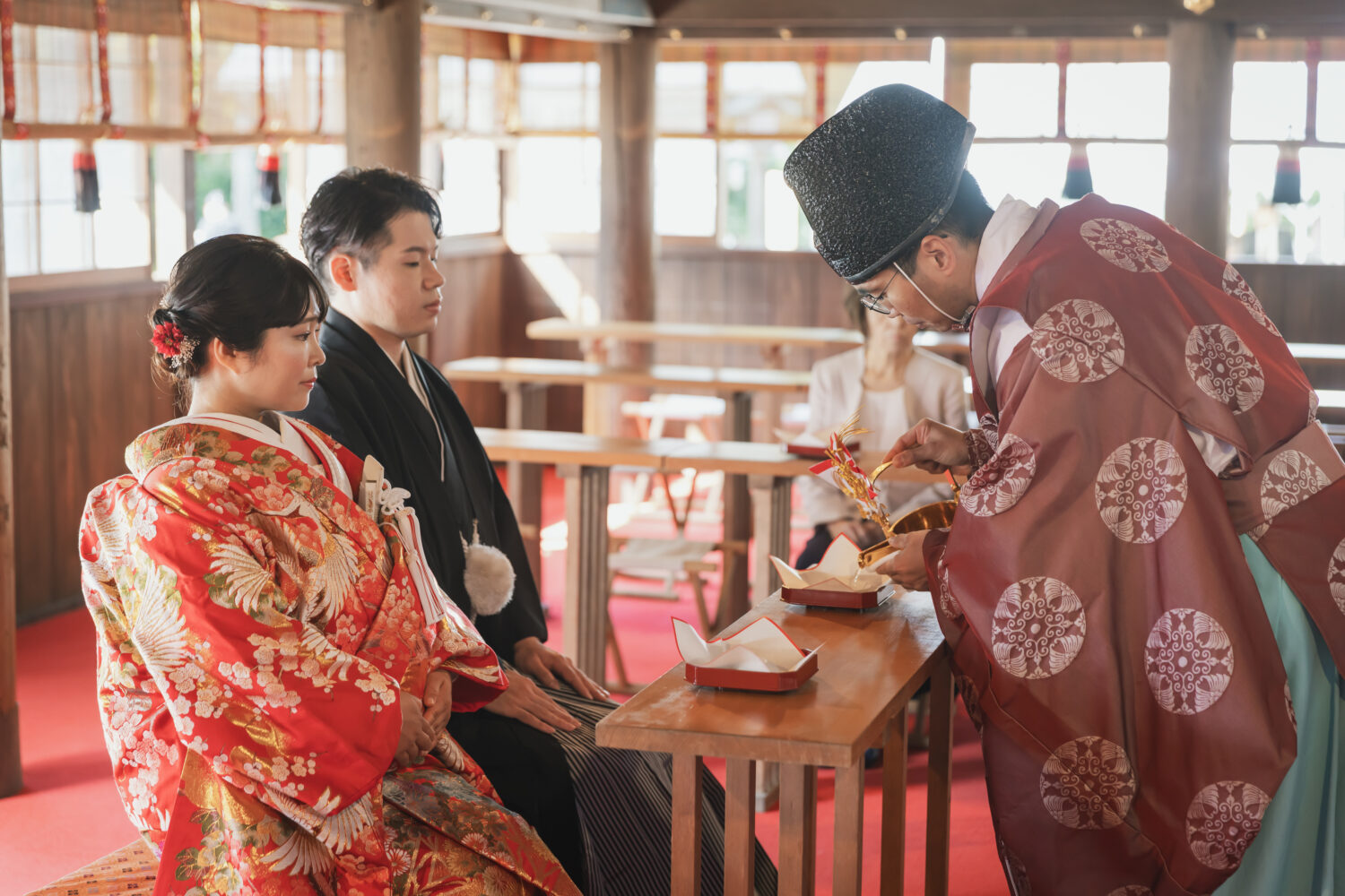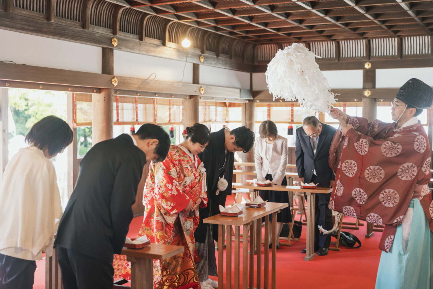 厳かな祝詞が響く中、ご家族に見守られながら、粛々と頭を垂れるご家族の姿は、まるで本当の結婚式そのもの。