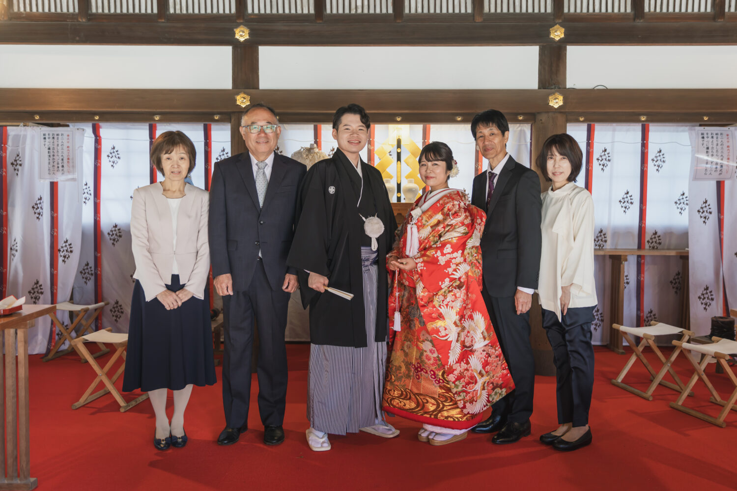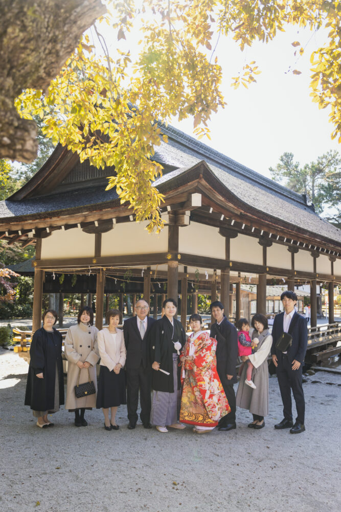 ご両家ご両親様もご参加いただきました撮影は、お天気にも恵まれ、澄んだ青空とやわらかな光が境内を包み込む、清々しい一日となりました。