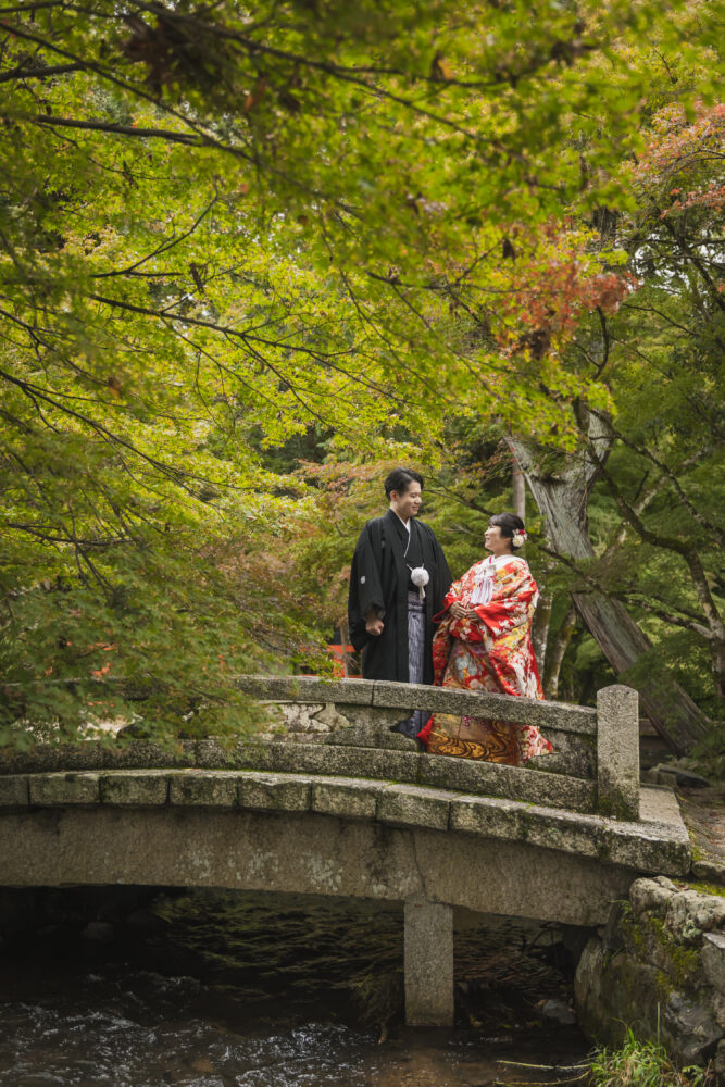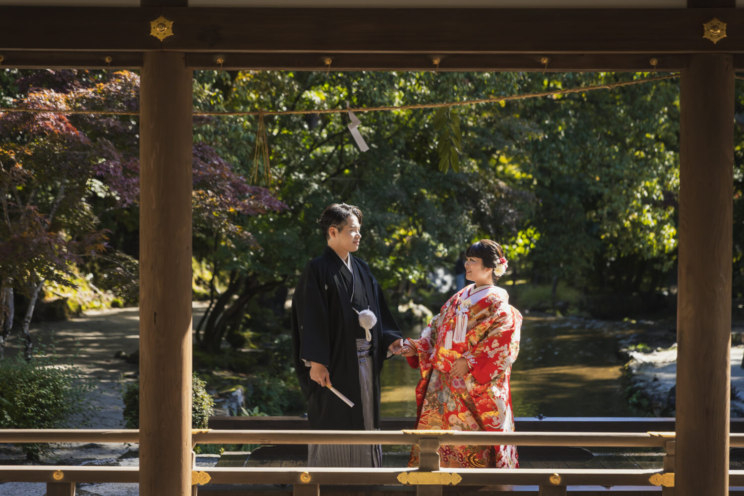 フォトウェディングでありながら、結婚式さながらのお写真が残せるもの「上賀茂神社プラン」だから叶う嬉しい撮影です。