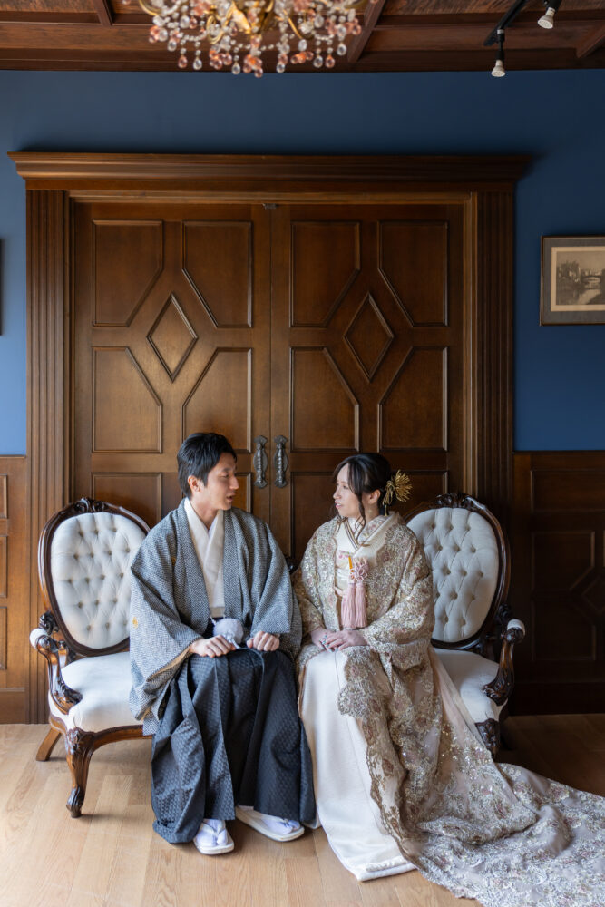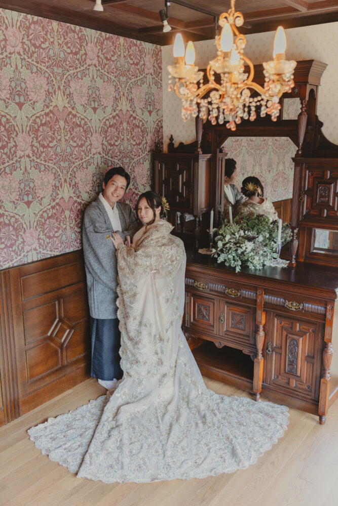 ドレスのような繊細なレースの色打掛と、イギリスの邸宅を思わせる当館のアンティークスタジオでのお写真は、また違った魅力を生み出してくれました。